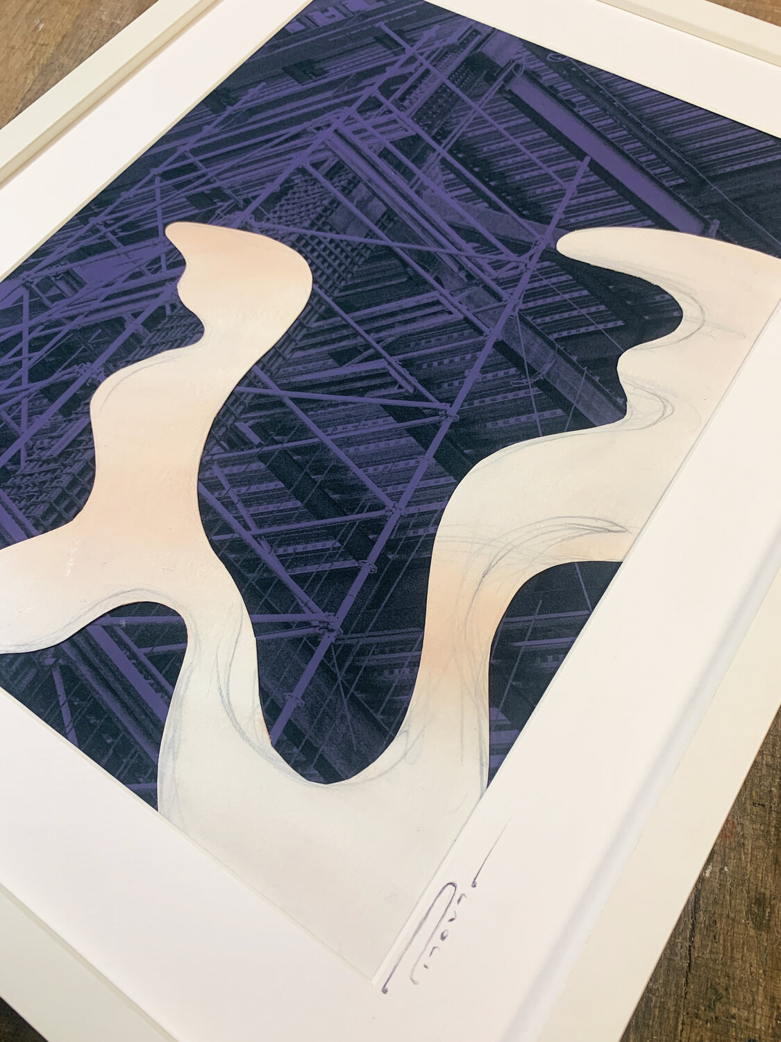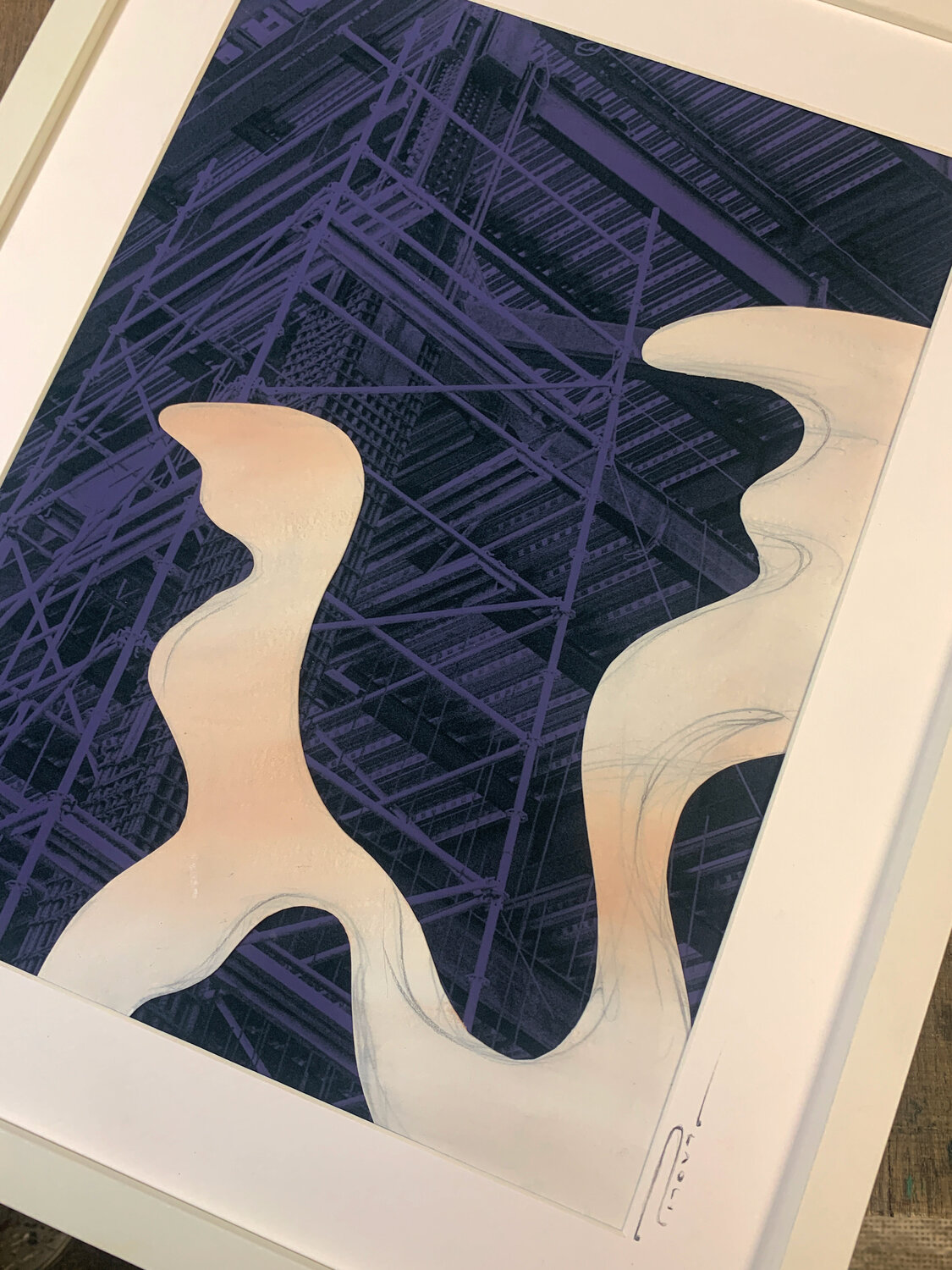 Created through the layering of photographic and hand-drawn elements, the piece explores the tension between human presence and constructed space, order and fluidity, matter and movement.