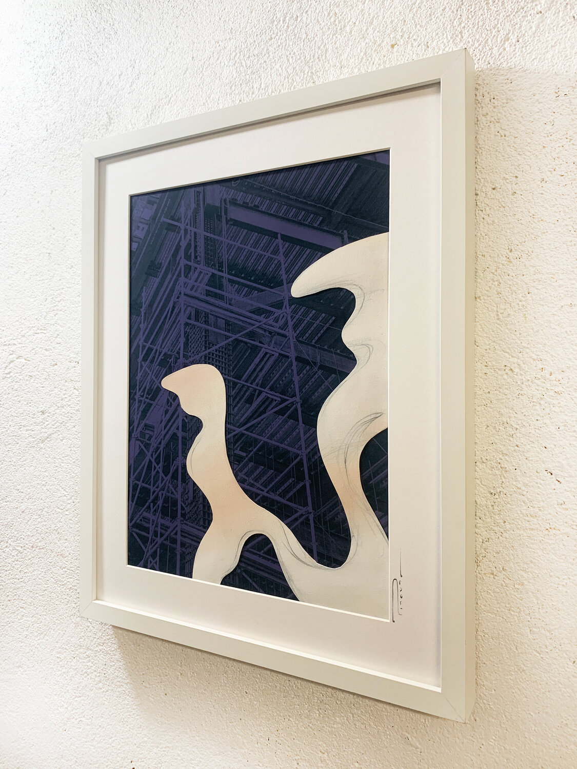 The rigid geometry of an urban framework meets soft, organic forms that seem to drift through it — like breath within architecture.