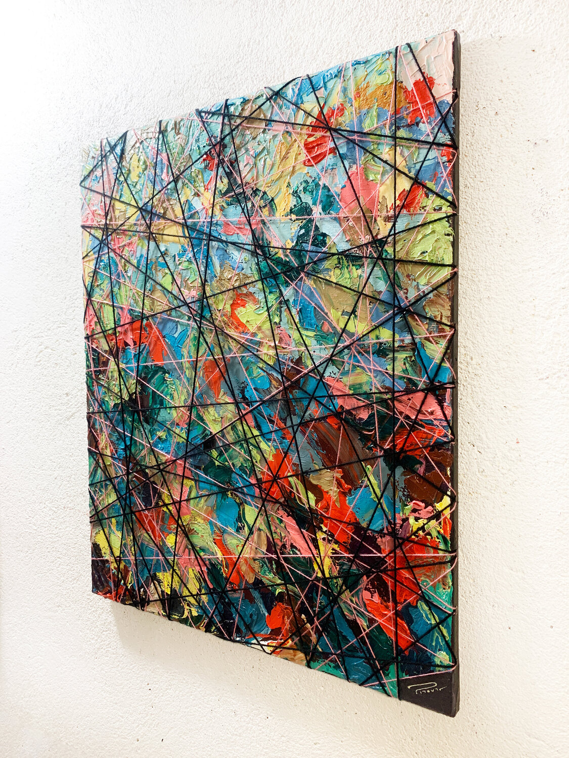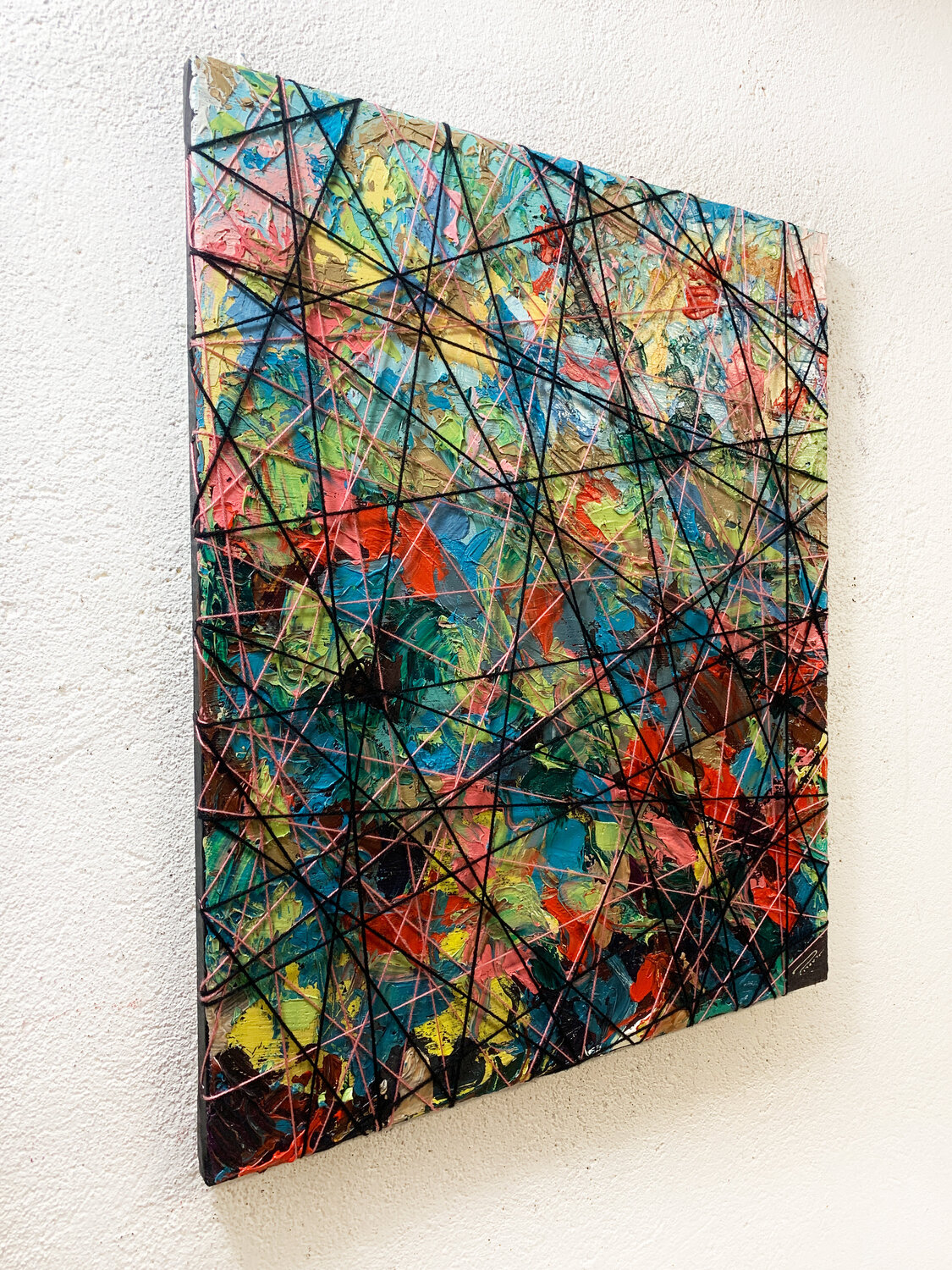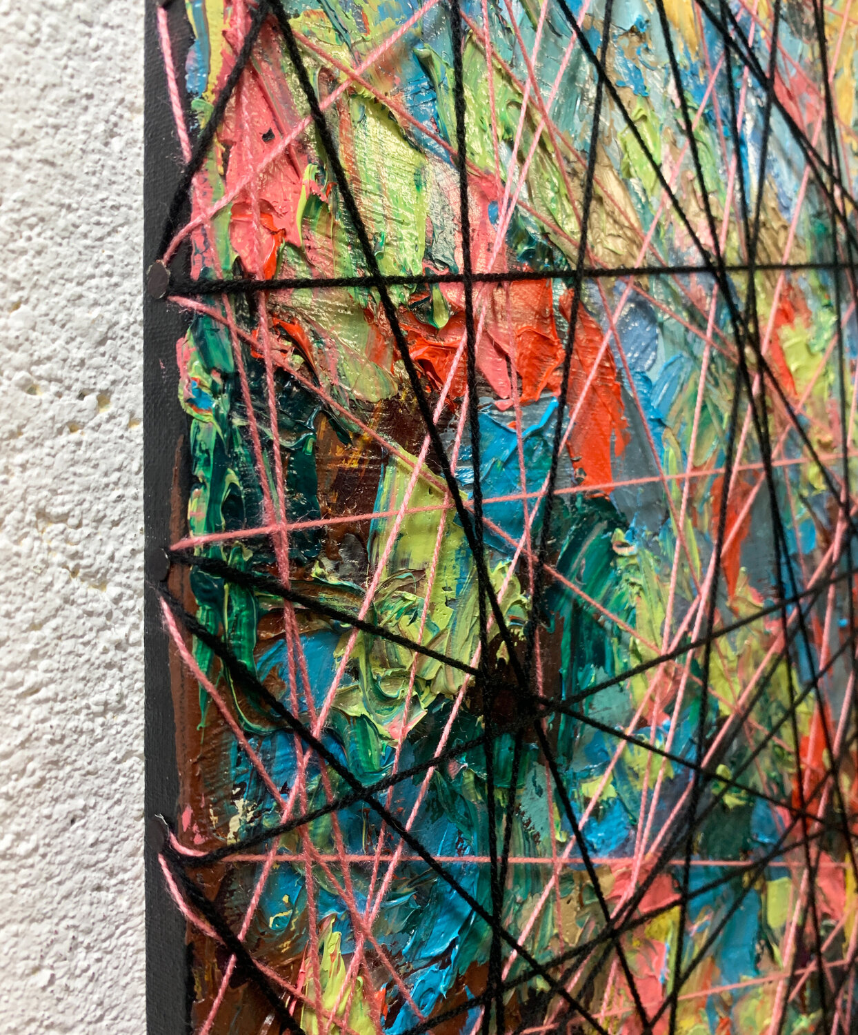 The compositions emerge from a chaotic base, with separating fibre tensions drawn across the canvas, creating both friction and harmony.