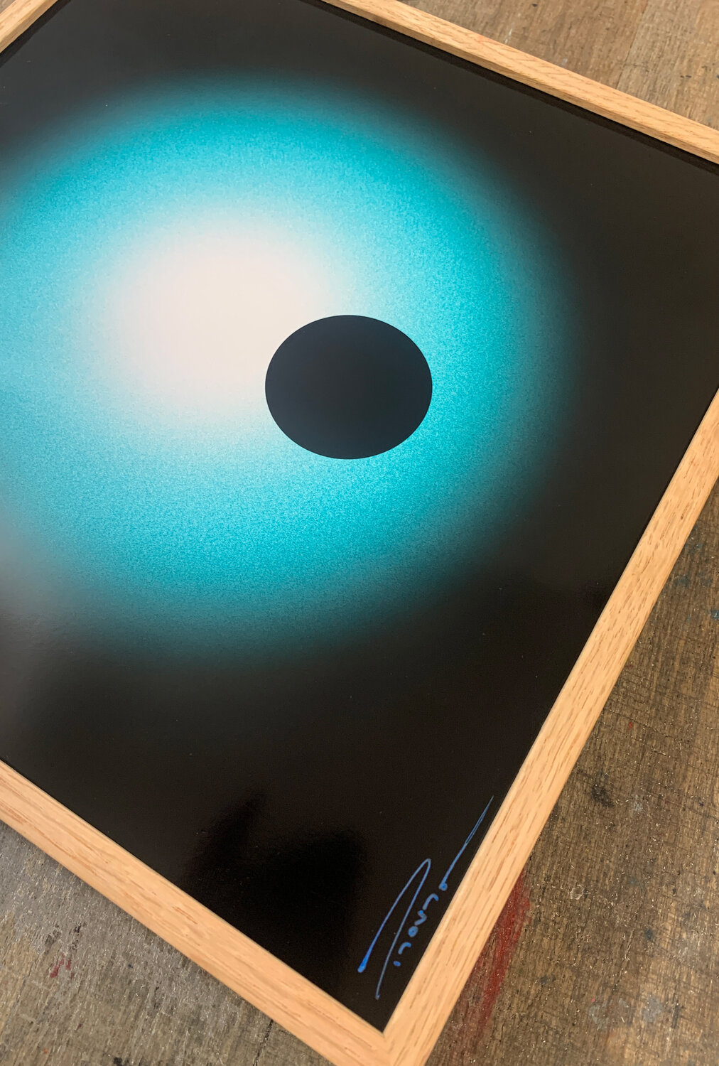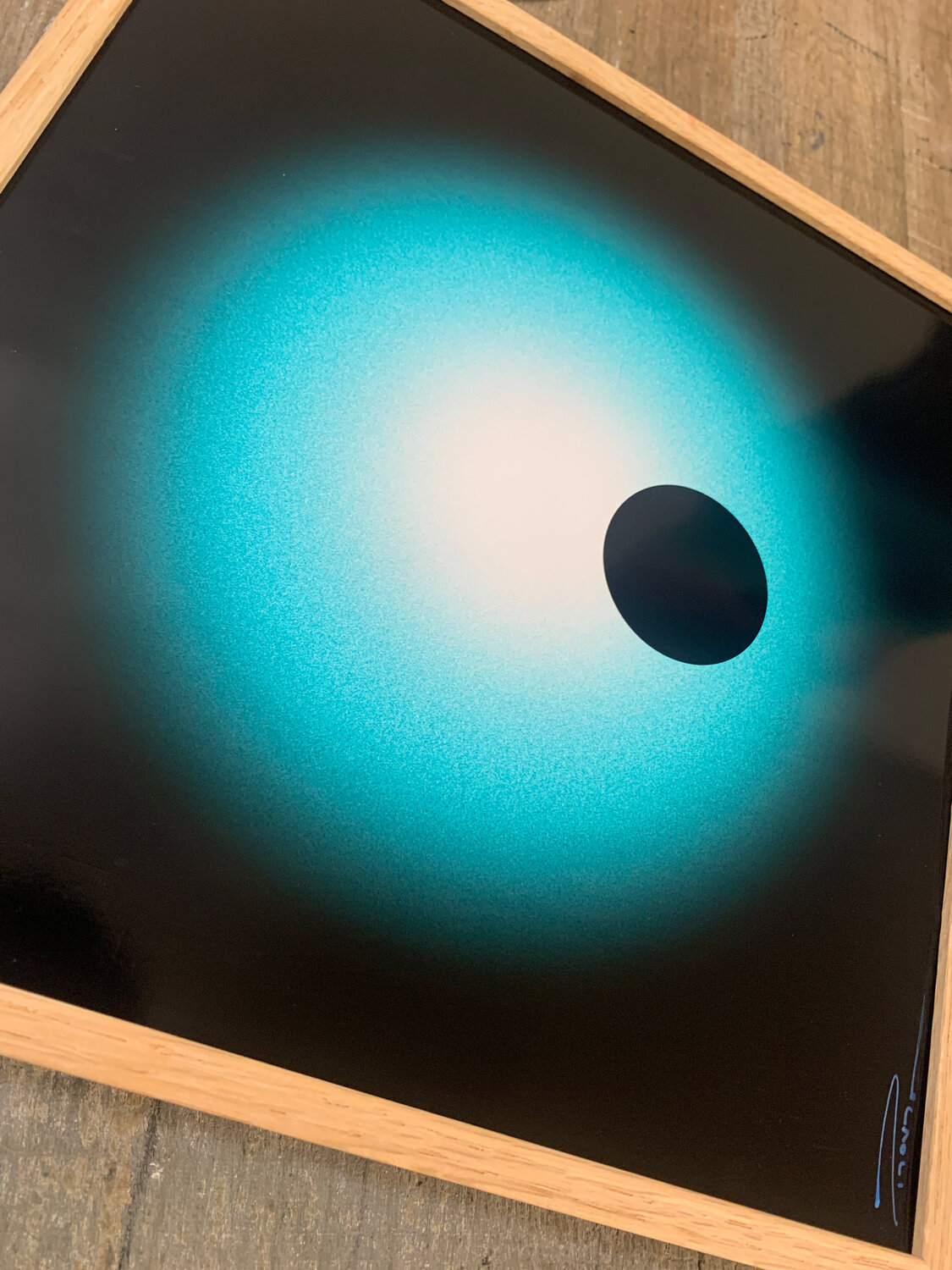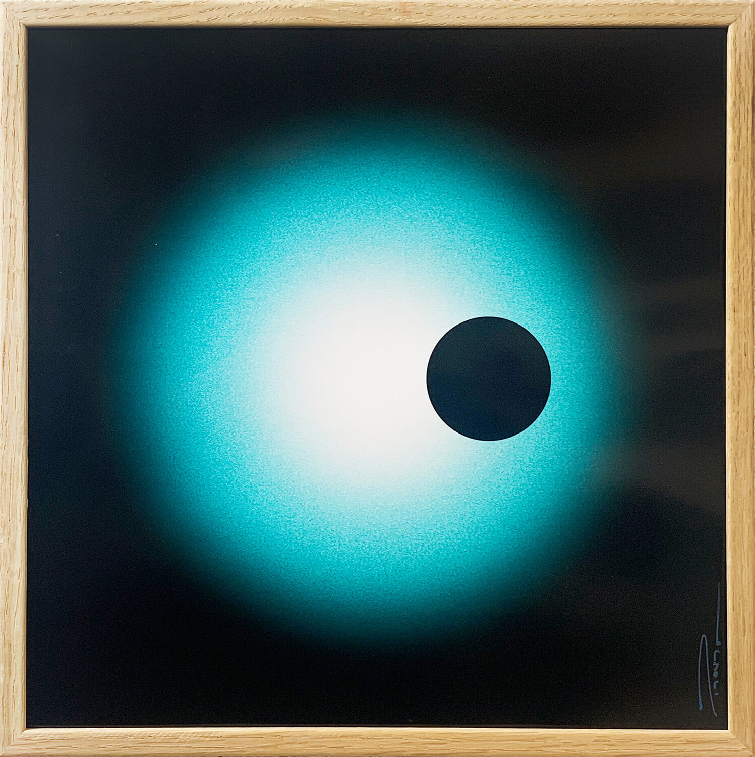 This unique hand-signed print from the Guidance series features a minimalist gradient expanding from a deep black centre into luminous red tones. Its soft, atmospheric diffusion creates a calm, meditative focal point that evokes intuition and inner clarity.