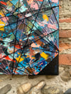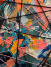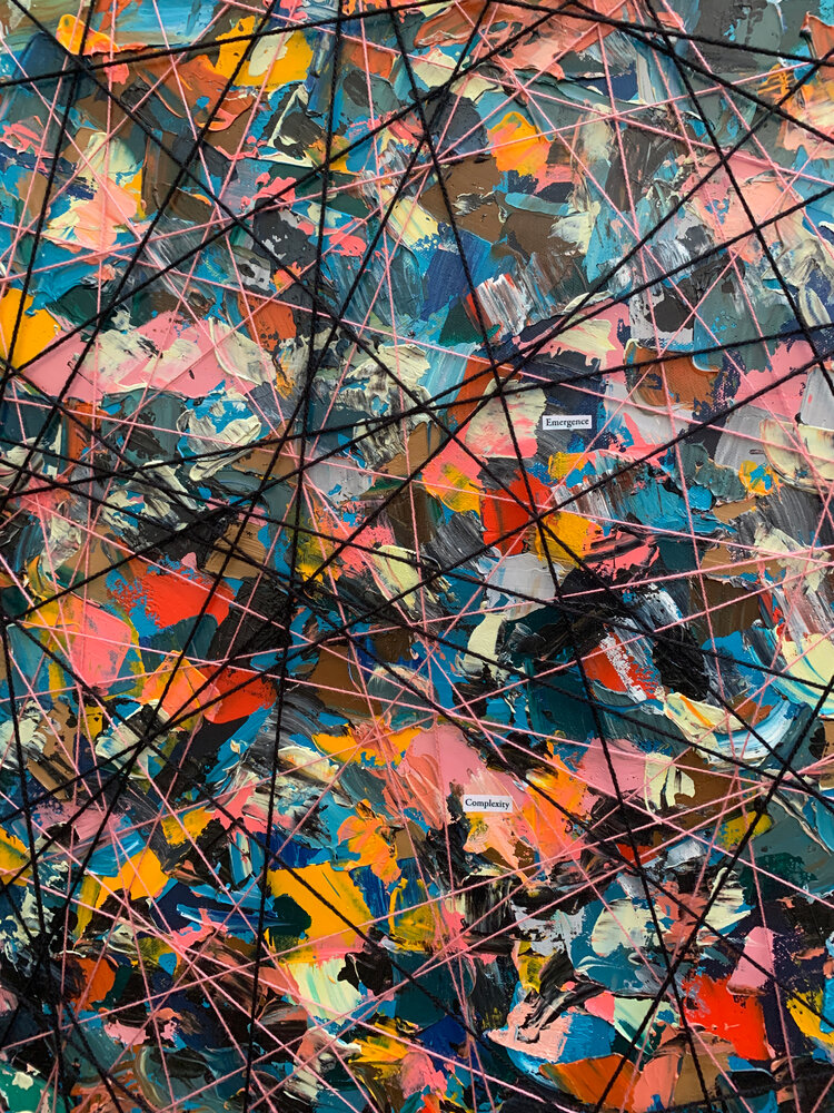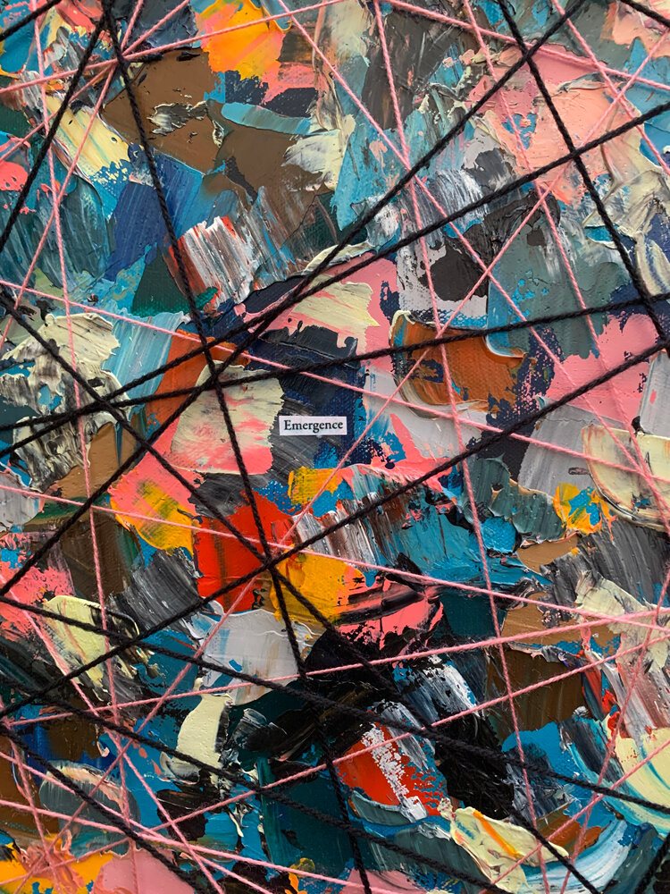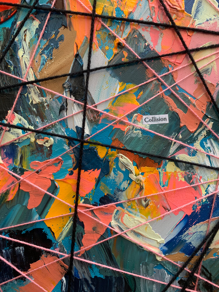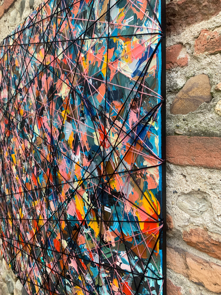 The compositions emerge from a chaotic base, with separating fibre tensions drawn across the canvas, creating both friction and harmony.