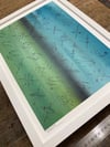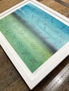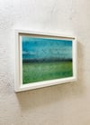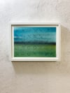 The colour gradient, shifting from sea blue to grass green, serves not only as a tranquil backdrop but subtly implies a horizon—perhaps gesturing toward the union of the terrestrial and the cosmic, the physical and the philosophical.
