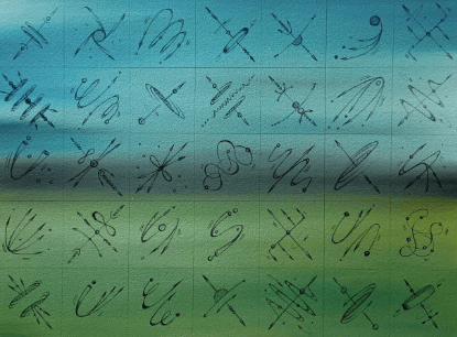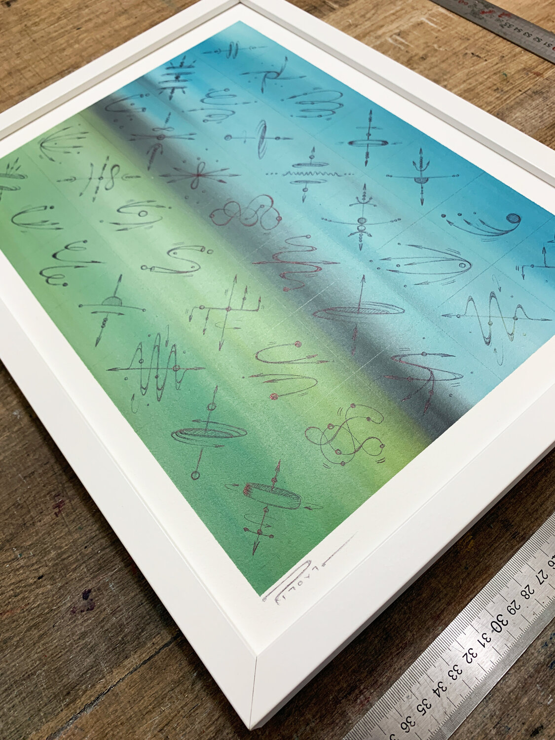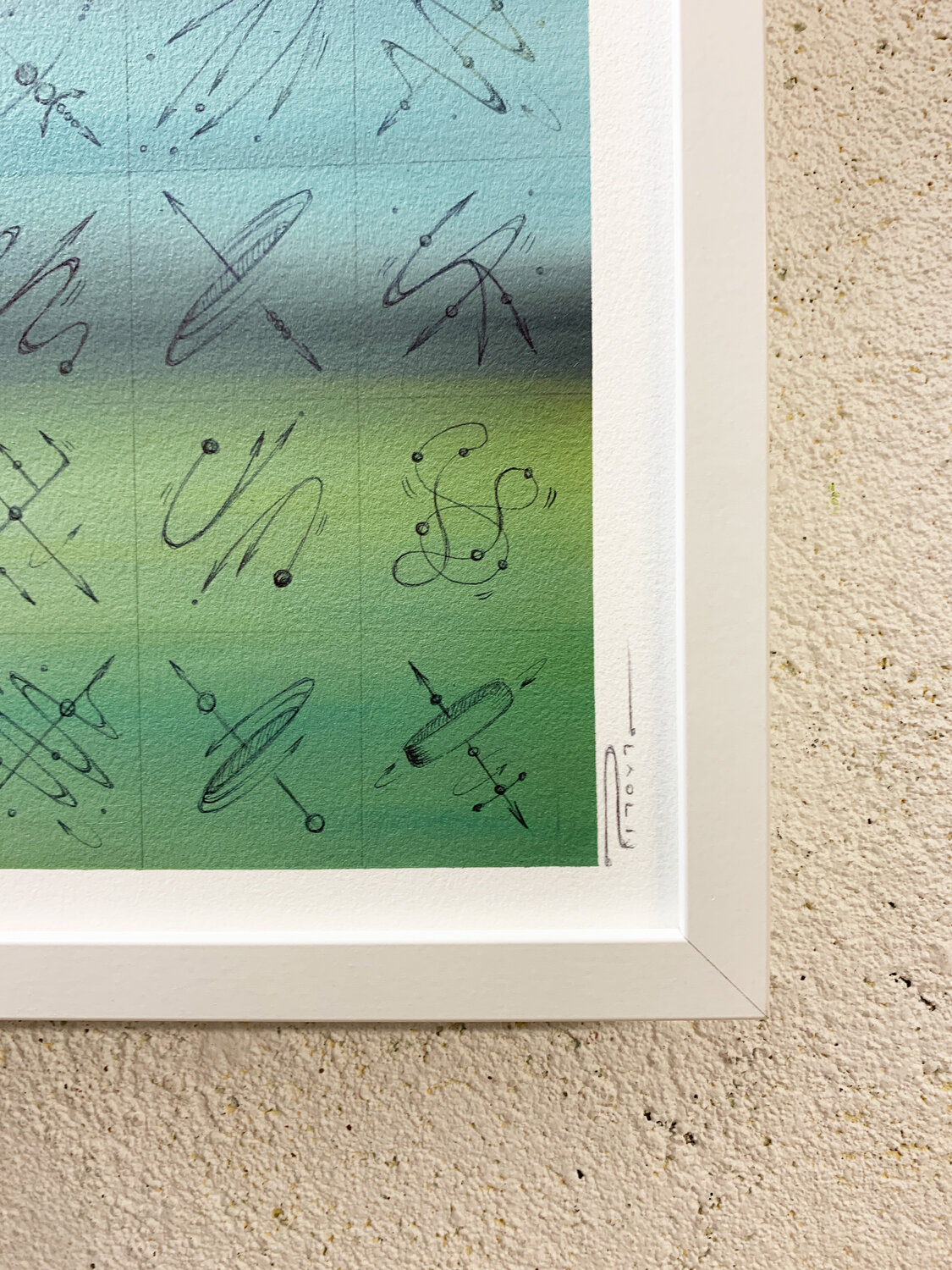 a meticulously arranged grid of abstract glyphs or cosmic diagrams, rendered with delicate ink lines against a gradient wash of turquoise and green. At first glance, the work suggests a fusion of celestial cartography, atomic structure, and surrealist notation—blurring the boundary between the scientific and the mystical.