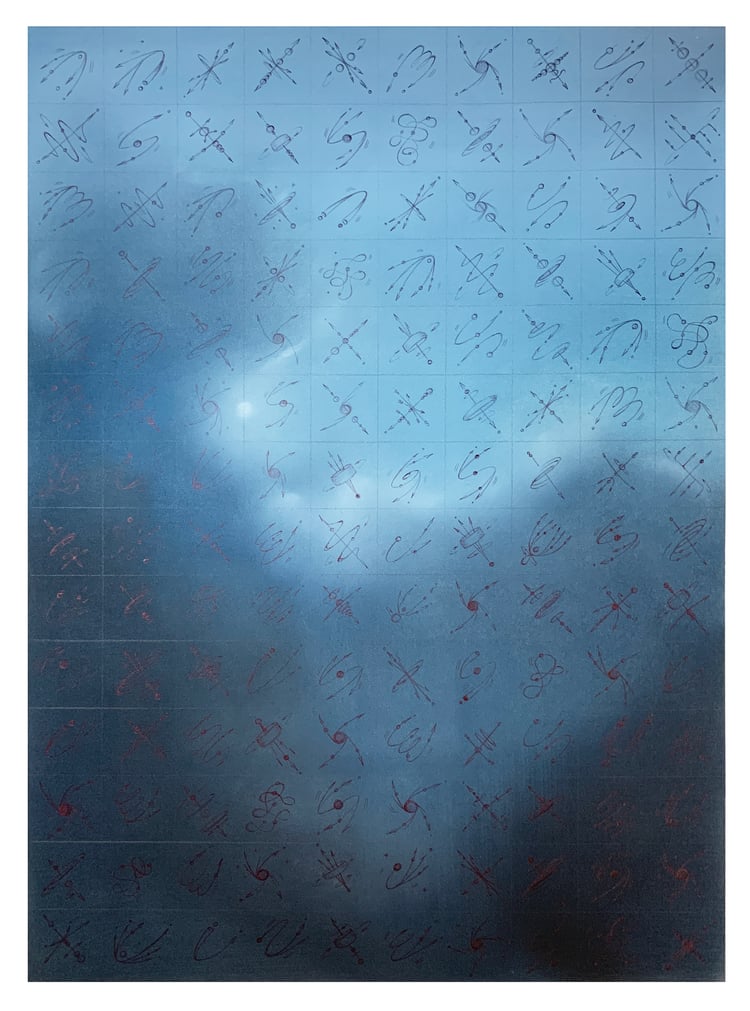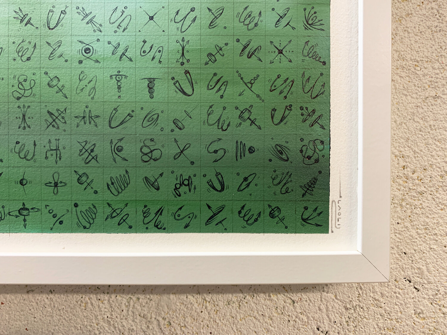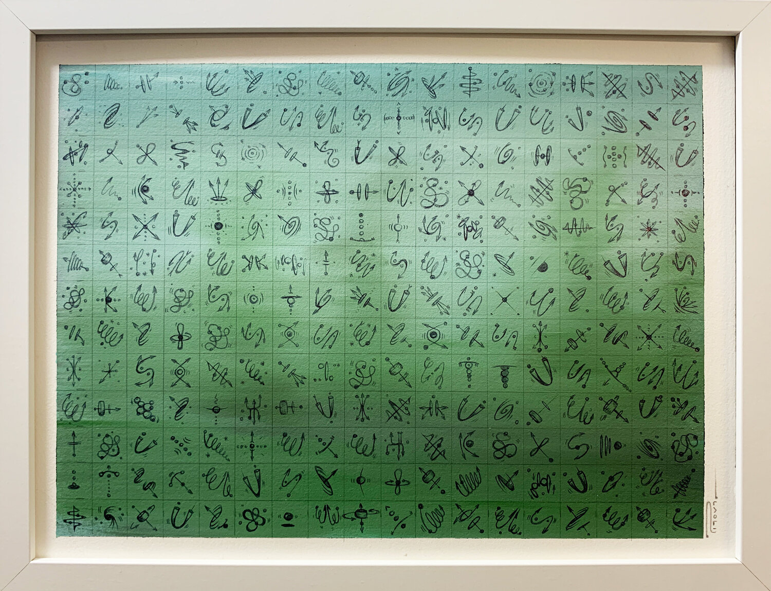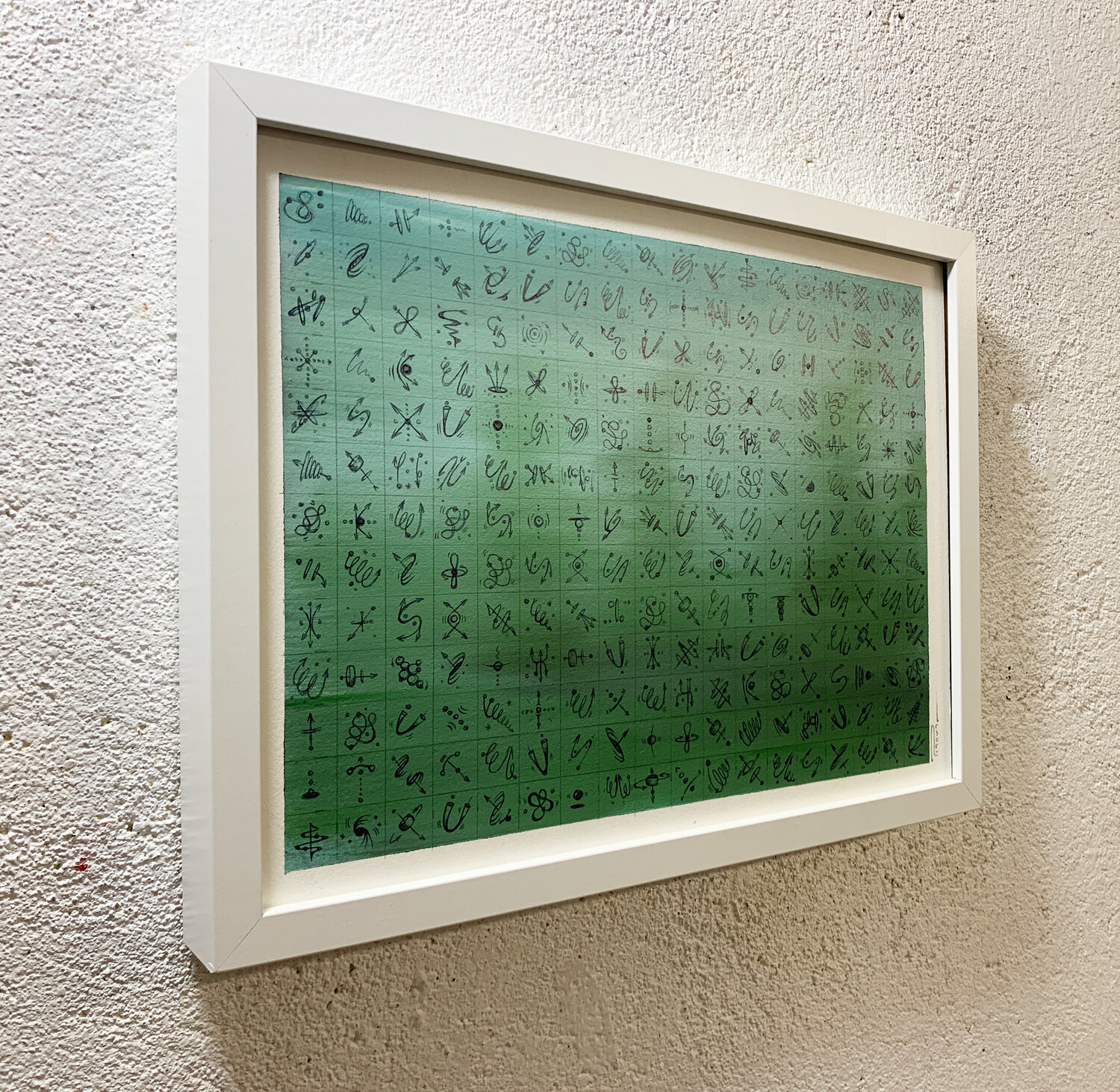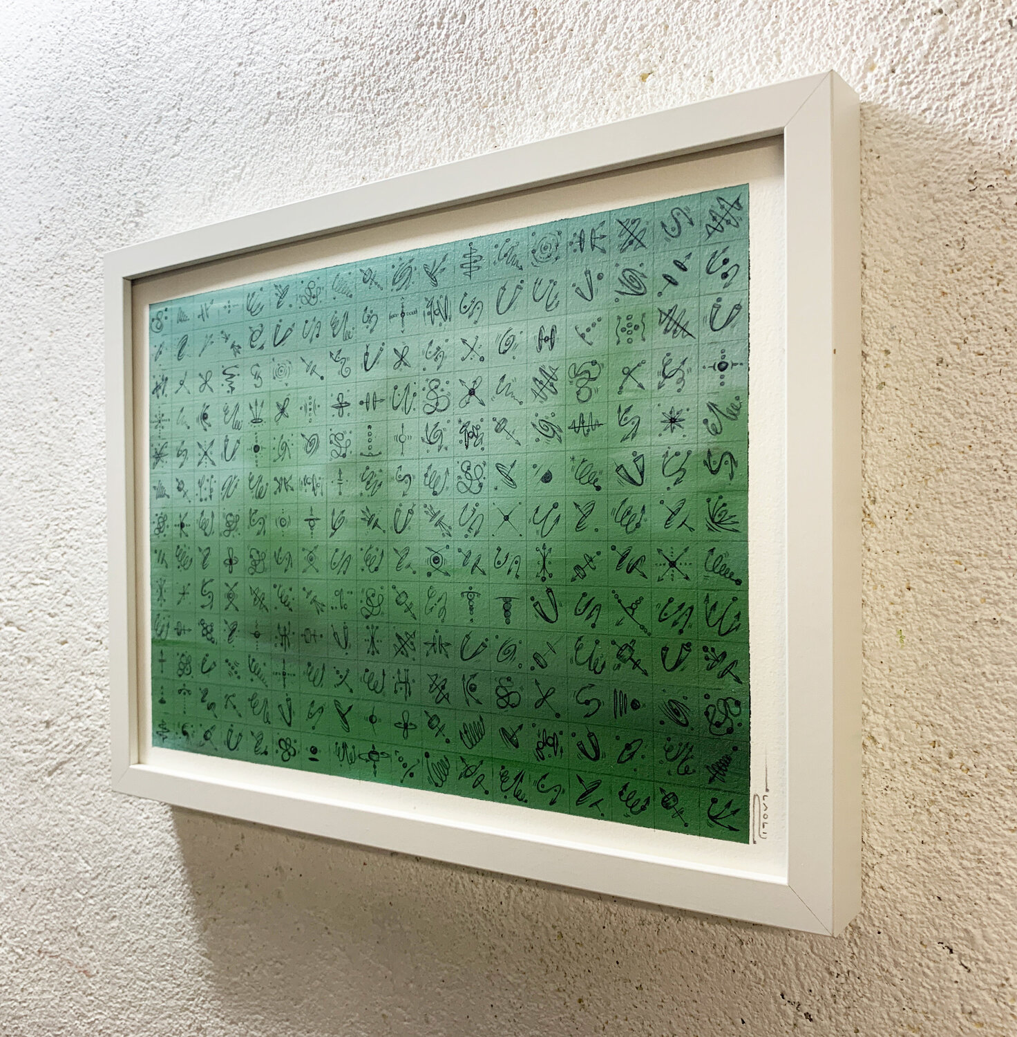a meticulously arranged grid of abstract glyphs or cosmic diagrams, rendered with delicate ink lines against a gradient wash of turquoise and green. At first glance, the work suggests a fusion of celestial cartography, atomic structure, and surrealist notation—blurring the boundary between the scientific and the mystical.