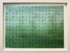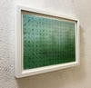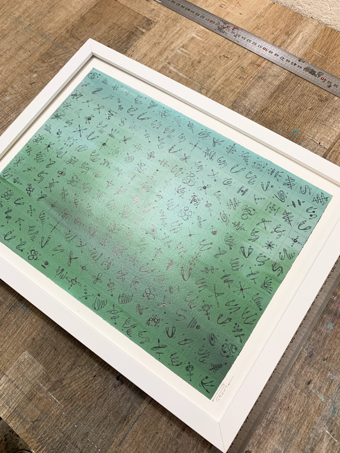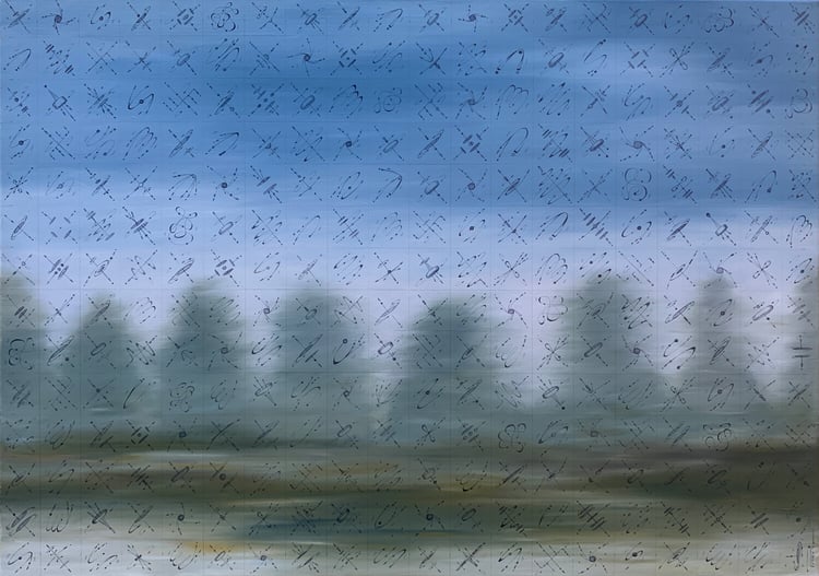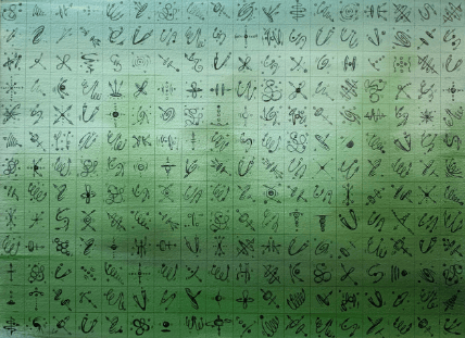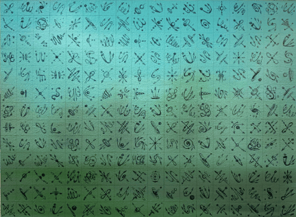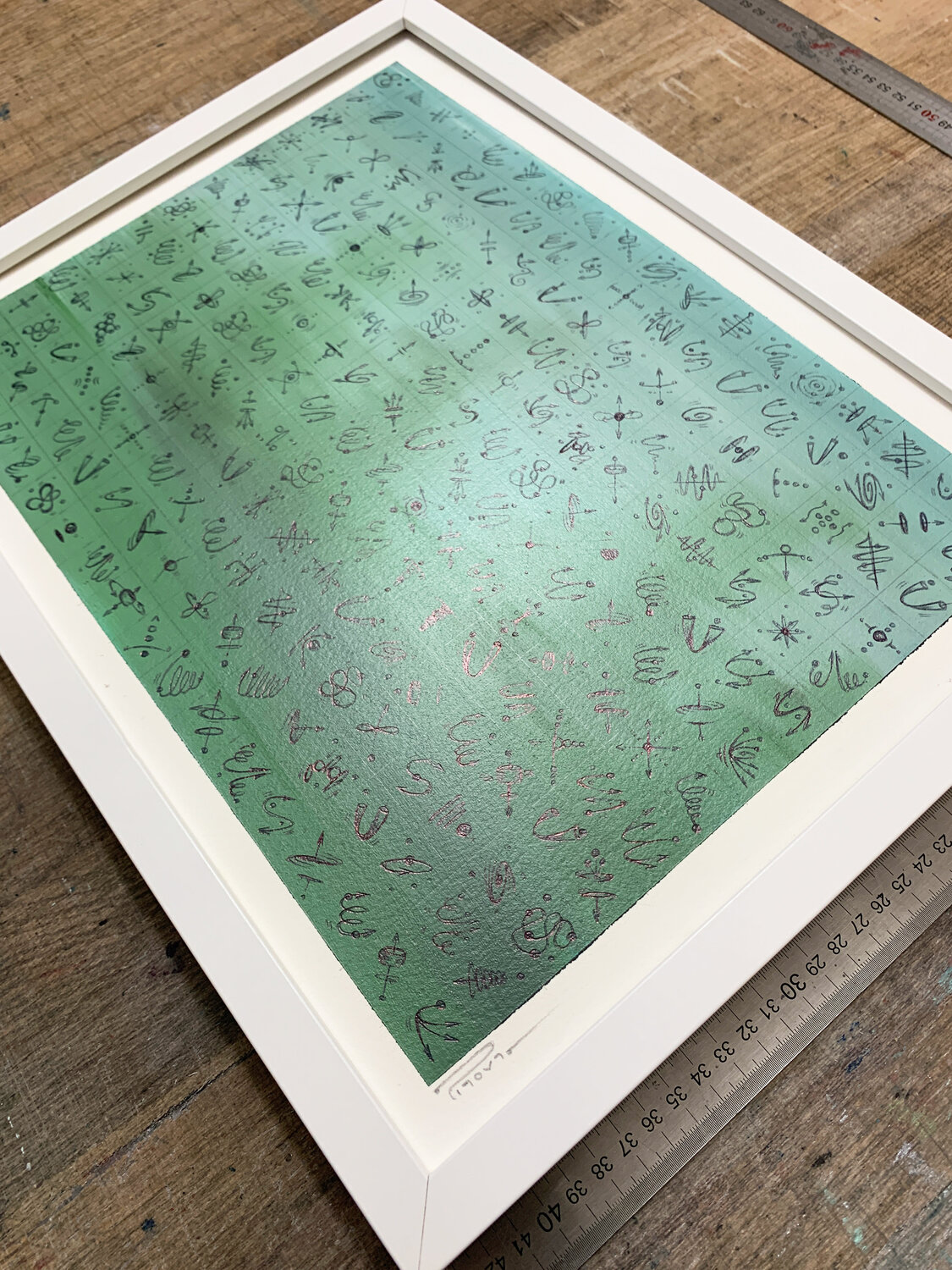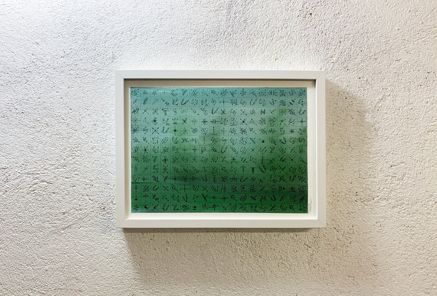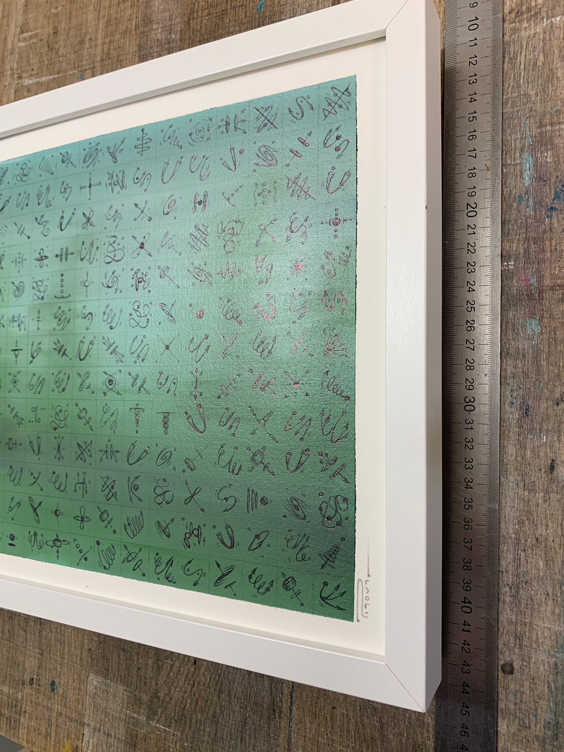 a meticulously arranged grid of abstract glyphs or cosmic diagrams, rendered with delicate ink lines against a gradient wash of turquoise and green. At first glance, the work suggests a fusion of celestial cartography, atomic structure, and surrealist notation—blurring the boundary between the scientific and the mystical.