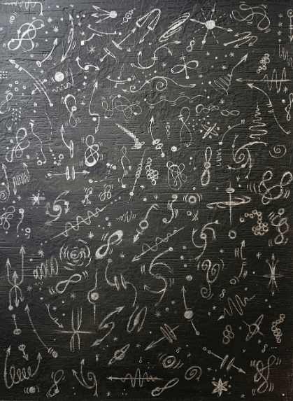 The repeated motif of elliptical orbits, directional vectors, and particle-like nodes evokes the language of particle physics, yet remains evocatively non-literal. This tension between recognizable form and imaginative abstraction is a hallmark of Pitout’s practice, where the metaphysical meets the methodical.