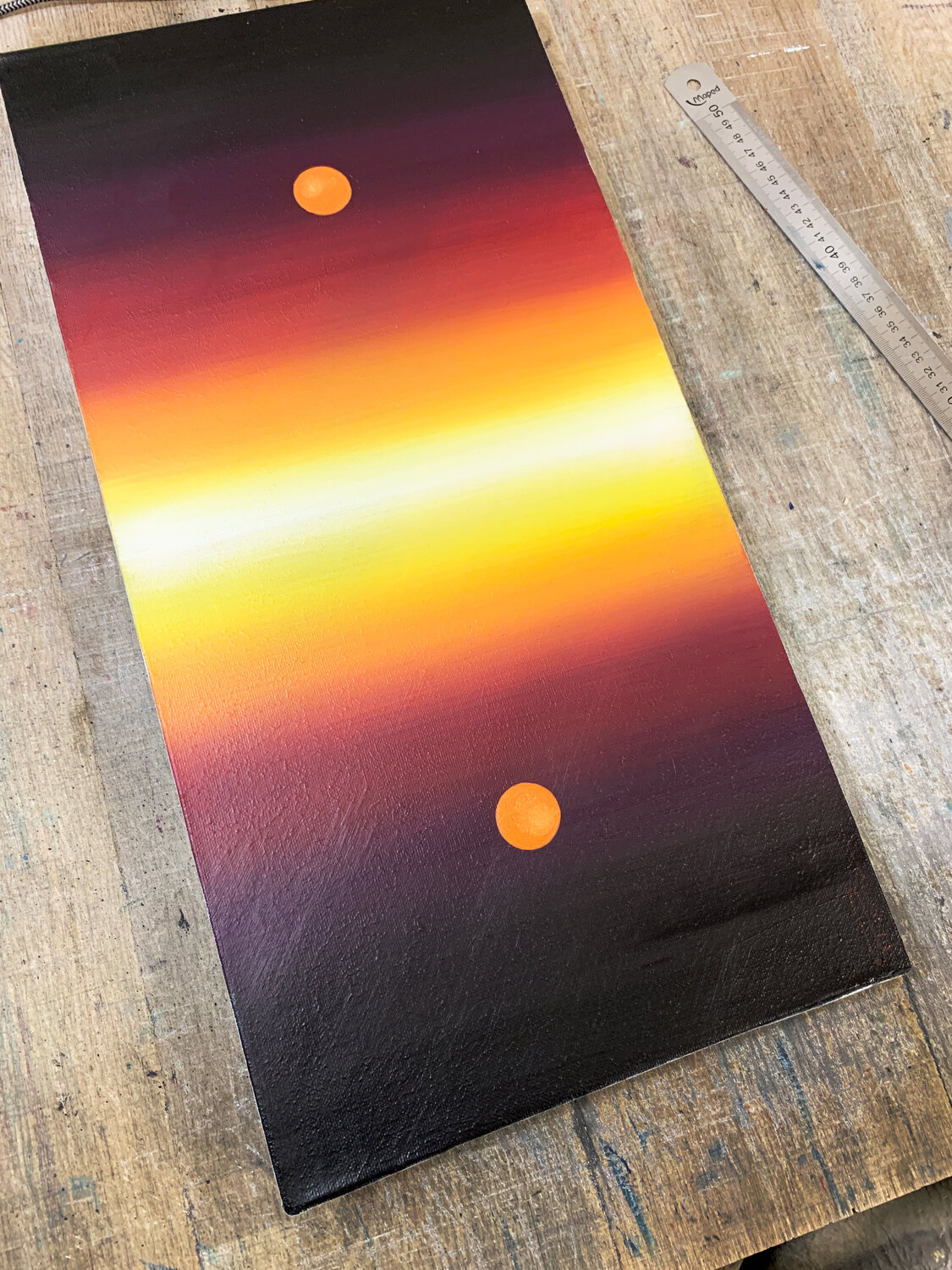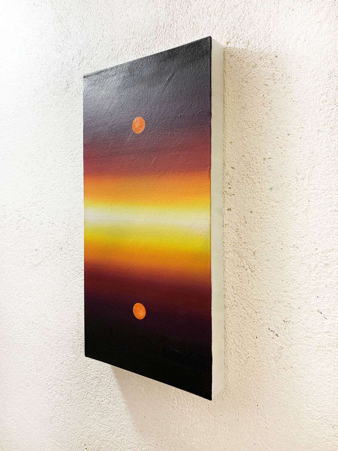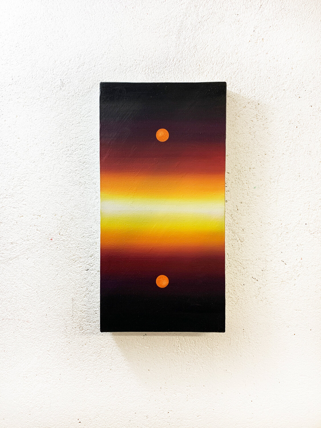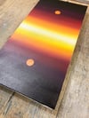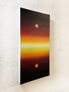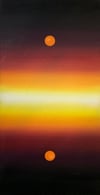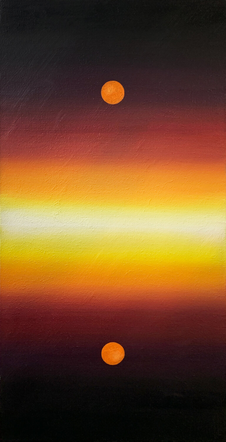 Two luminous orbs, suspended above and below a horizon of radiant gradients, create a meditative symmetry.