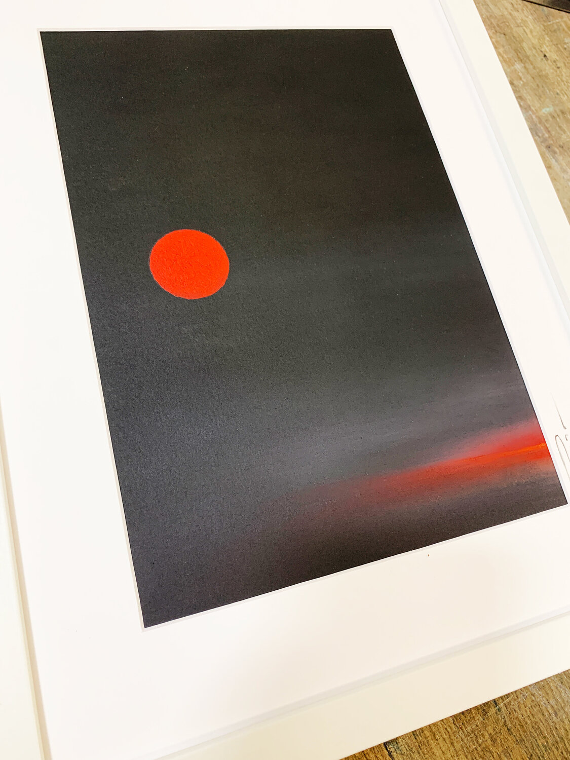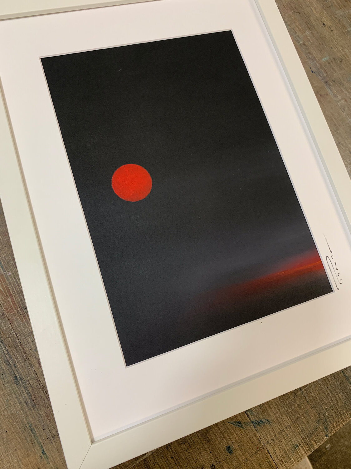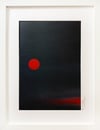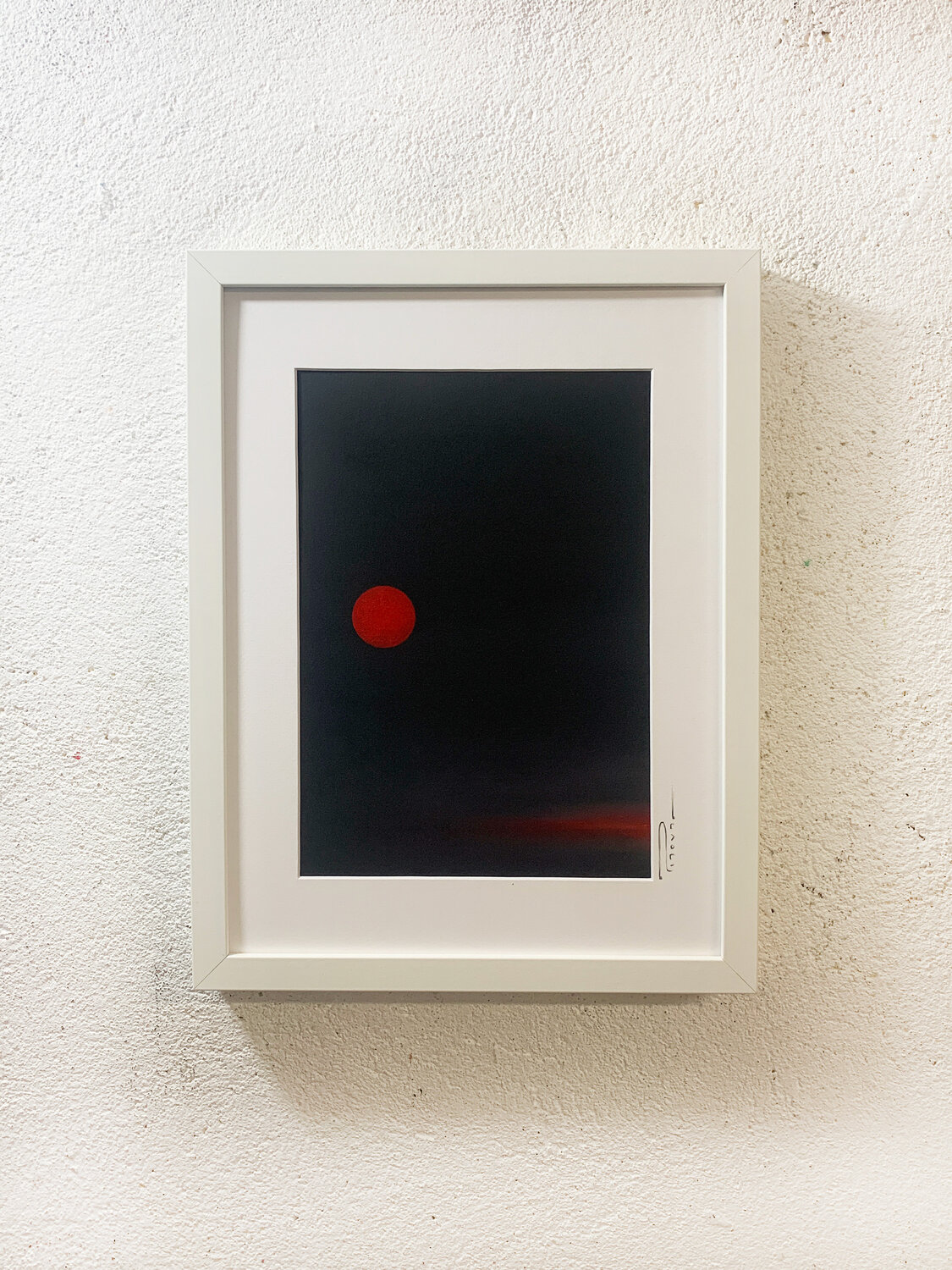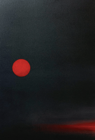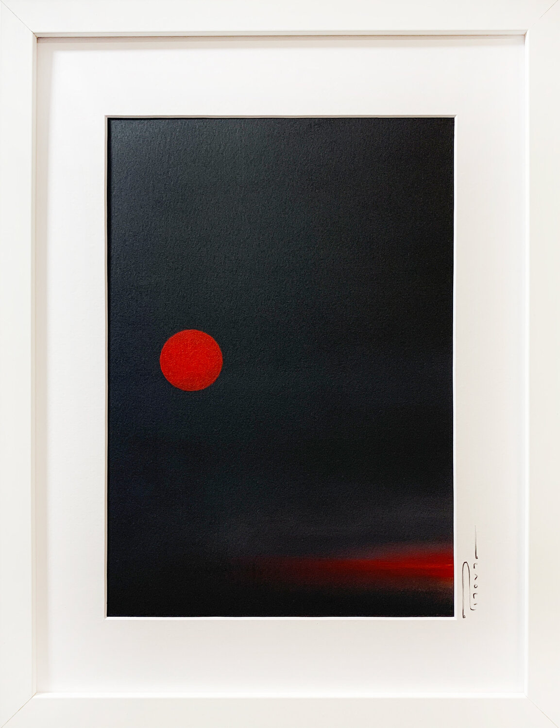 A singular crimson orb floats in a blackened sky, evoking both cosmic grandeur and apocalyptic stillness.