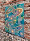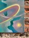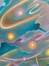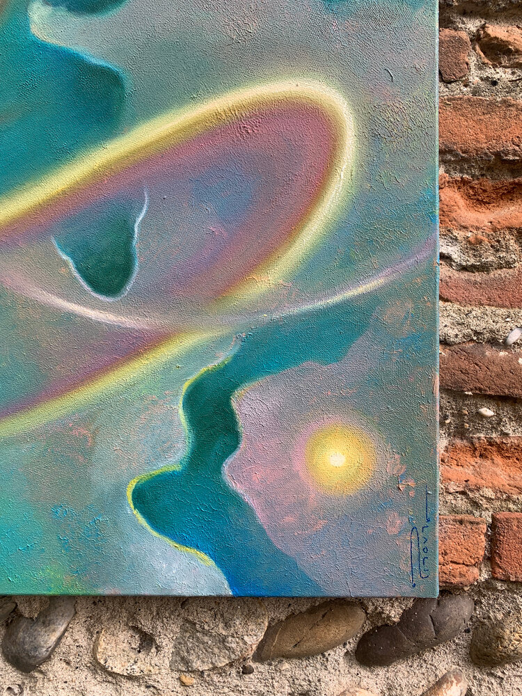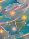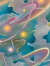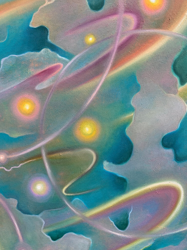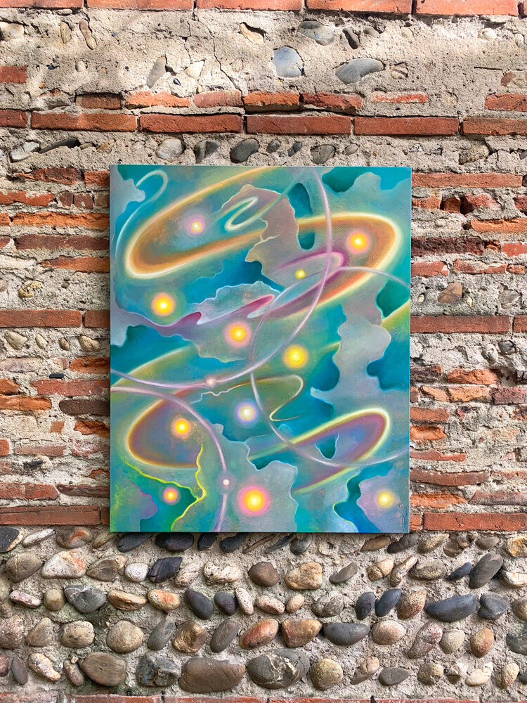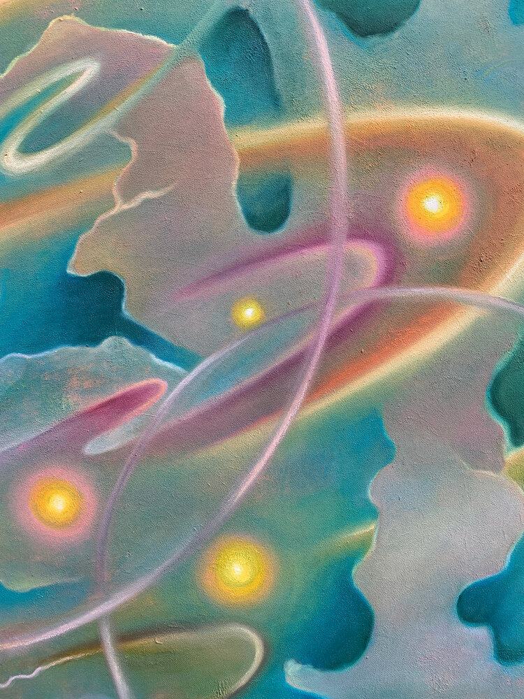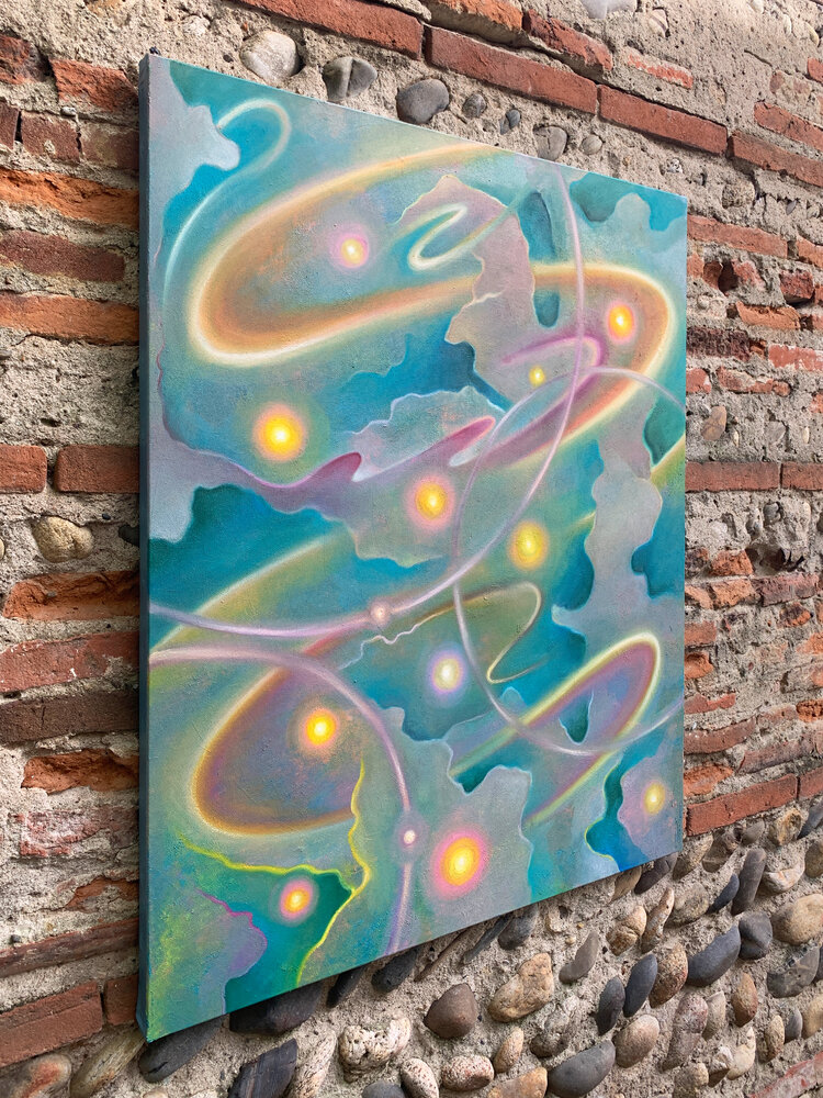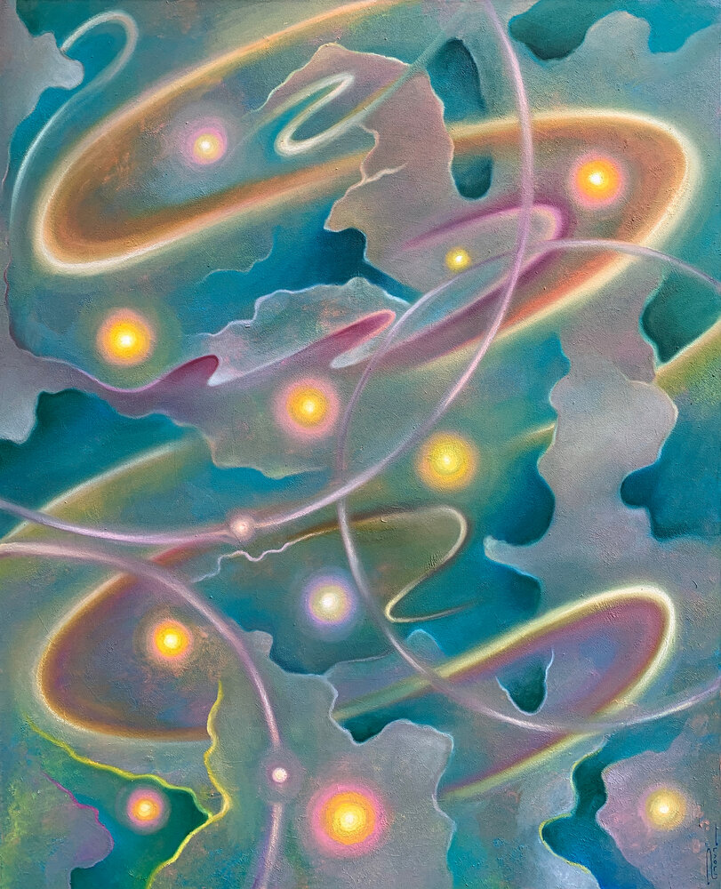 This painting captures the ceaseless movement of illumination — spirals of radiance that seem to dance through air and matter alike.